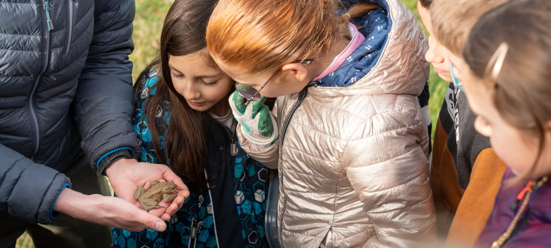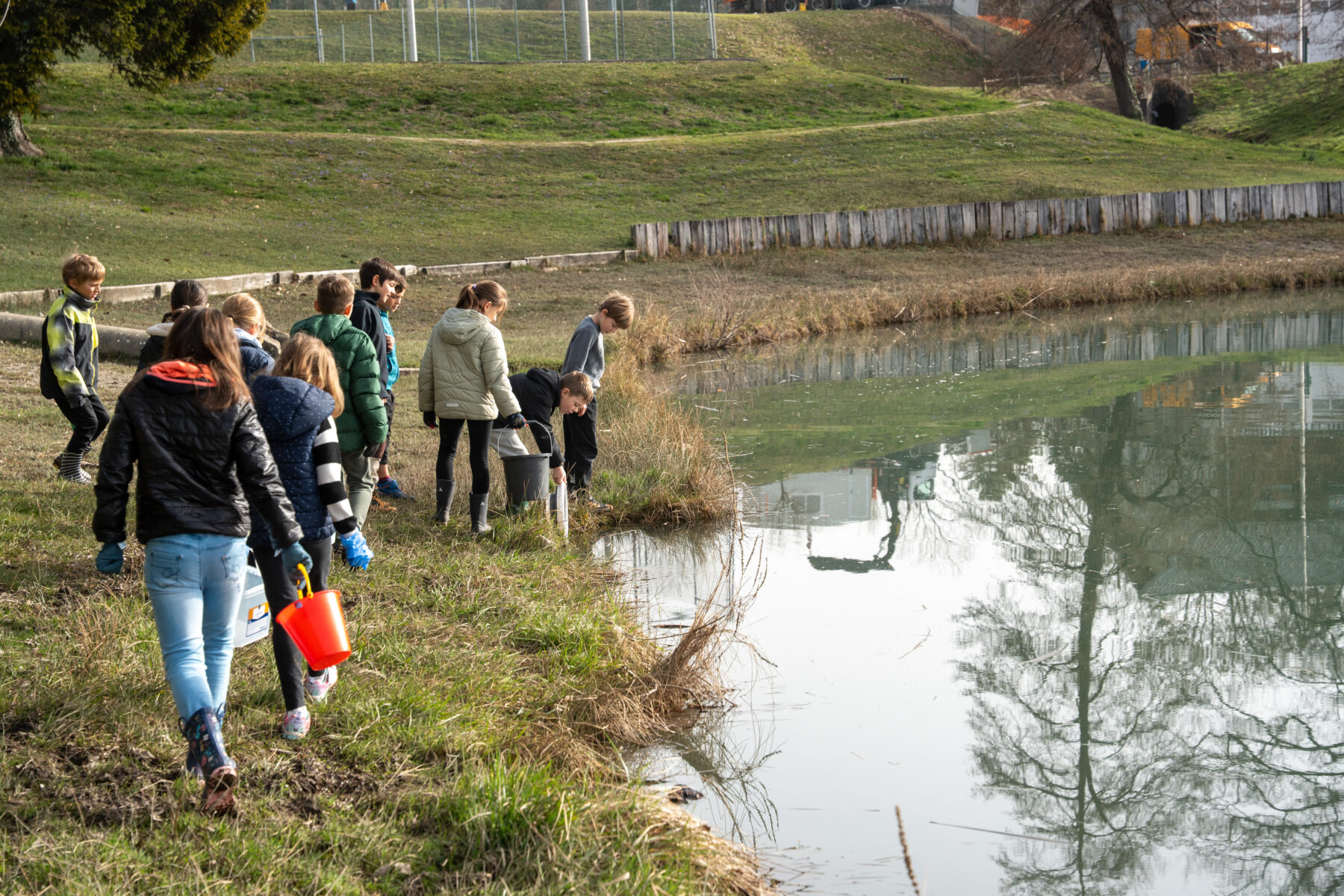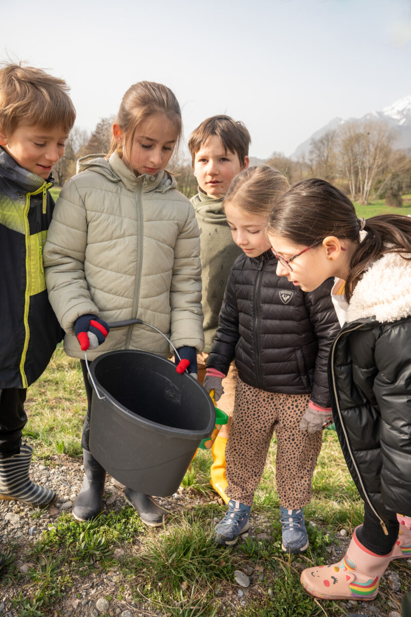 Le long des filets, la petite troupe a distancé les adultes. Des cris fusent « Oh ils sont trop choux ! », « Il est trop mimi ! » mais aussi « Bêêêrk, c’est pas très appétissant ! ». Les plus hardis attrapent les animaux à main nues, comme Anna, qui explique : « Je prends déjà des escargots et des limaces, alors un crapaud, ça ne me gêne pas ! » D’autres sont plus hésitants, malgré leurs gants de jardinage. Une fois dans les seaux, les crapauds se laissent observer. « Il a fait pipi, celui-là ! », « Il a plein de muscles ! », « Il fait de la nage dans mon seau ! ». Charlie Foulon corrige certains propos : « Non, la grenouille n’est pas la femelle du crapaud ! ». Il glisse aussi des informations : « Un crapaud vit entre 7 et 10 ans. Il a donc le temps de faire environ 7 allers/retours à son étang natal pour se reproduire ! » Enfin, au risque de tomber dans l’eau, tout le monde se presse au bord de l’eau pour le lâcher. Un par un, les batraciens sont déposés à la surface de l’eau. Puis Charlie Foulon leur montre les œufs, noirs, disposés en rubans dans les roseaux de la rive. La maîtresse, elle, anticipe tout ce qu’elle pourra tirer de cette séance en extérieur : « C’est quelque chose de concret, qui a du sens, sur leur lieu de vie ! Et puis en observant cet animal méconnu, qui n’a pas forcément bonne réputation – on va pouvoir tirer plein de fils à partir de cette matinée ! » Y compris sur le « savoir nager », que sa classe expérimente lors des séances de piscine : « Regardez le mouvement de la brasse ! Regardez comme il le fait bien ! »