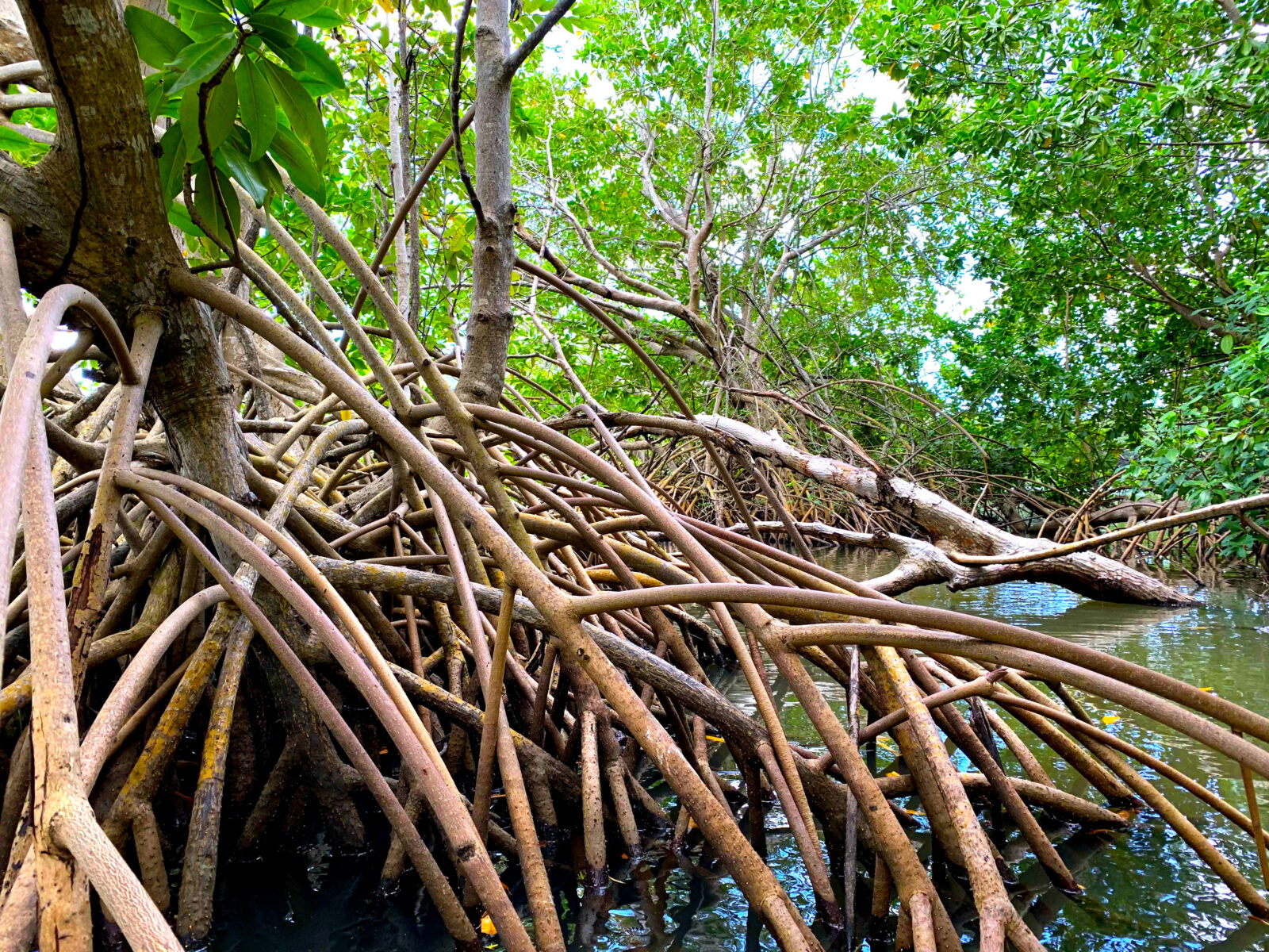 Côté mer, on voit des arbres, ni trop grands, ni trop petits, serrés les uns contre les autres. Les racines des arbres débordent de leur tronc pour aller plonger dans la mer et s'ancrer dans le sable. Et puis, en avançant dans la mangrove, il y a un autre type d'arbre. On l’appelle le palétuvier noir en Guadeloupe. Il pousse dans un sol très boueux, où il y a beaucoup de sel et peu d'oxygène, donc il n'arrive pas à respirer. Il fait alors ressortir ses racines à l'extérieur de la terre, comme des tubas.